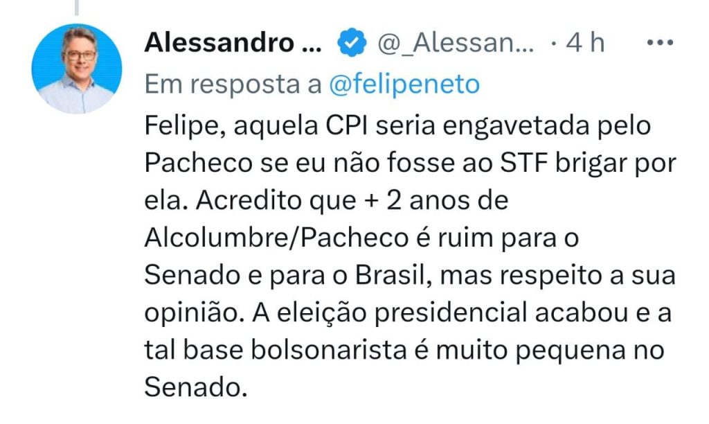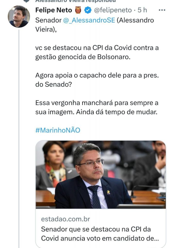Em entrevista à rádio Fan FM, Vieira declarou voto em Marinho e justificou: “Eu entendo que é necessário ter uma alternância de poder no Senado”. Apesar disso, o posicionamento desagradou o youtuber Felipe Neto, que marcou o próprio senador na postagem para criticá-lo e ressaltou que ele ainda pode mudar a intenção de voto. “Senador @_AlessandroSE (Alessandro Vieira), você se destacou na CPI da COVID contra a gestão genocida de Bolsonaro. Agora apoia o capacho dele para a presidência do Senado? Essa vergonha manchará para sempre sua imagem. Ainda dá tempo de mudar”, escreveu.