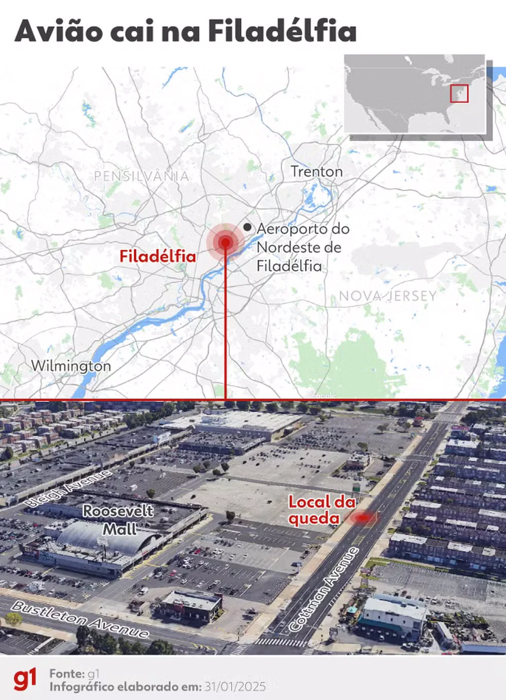 Uma aeronave de transporte aeromédico caiu e explodiu nesta sexta-feira (31) nas proximidades do shopping Roosevelt Mall, na Filadélfia, Estados Unidos. A bordo estavam seis pessoas, incluindo uma criança paciente que estava sendo transportada do México para casa, acompanhada de sua mãe.