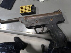Durante as buscas, os militares encontraram ainda uma arma de fogo tipo garrucha calibre .22 e 41 munições enterradas em um buraco. O muro da residência apresentava pichações vermelhas, já borradas, com símbolos relacionados a uma facção criminosa.