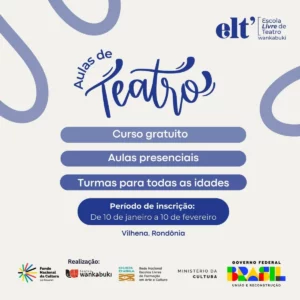 Uma nova porta se abre para os amantes das artes cênicas em Vilhena, RO. A Escola Livre de Teatro Wankabuki (ELTW) está oferecendo cursos gratuitos de teatro para todas as idades, através de um projeto contemplado pelo Governo Federal. As inscrições já estão abertas e seguem até 10 de fevereiro, com aulas programadas para começar em 17 de fevereiro.