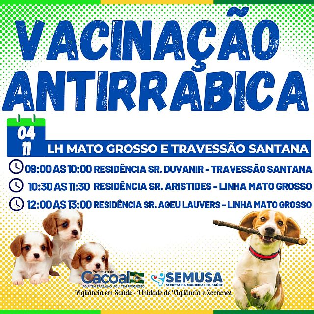 A Prefeitura de Cacoal, através da Secretaria Municipal de Saúde (SEMUSA), vem intensificando a Campanha de Vacinação Antirrábica na Área Rural do Município. A imunização de cães e gatos ocorre até o próximo dia 14 de novembro.