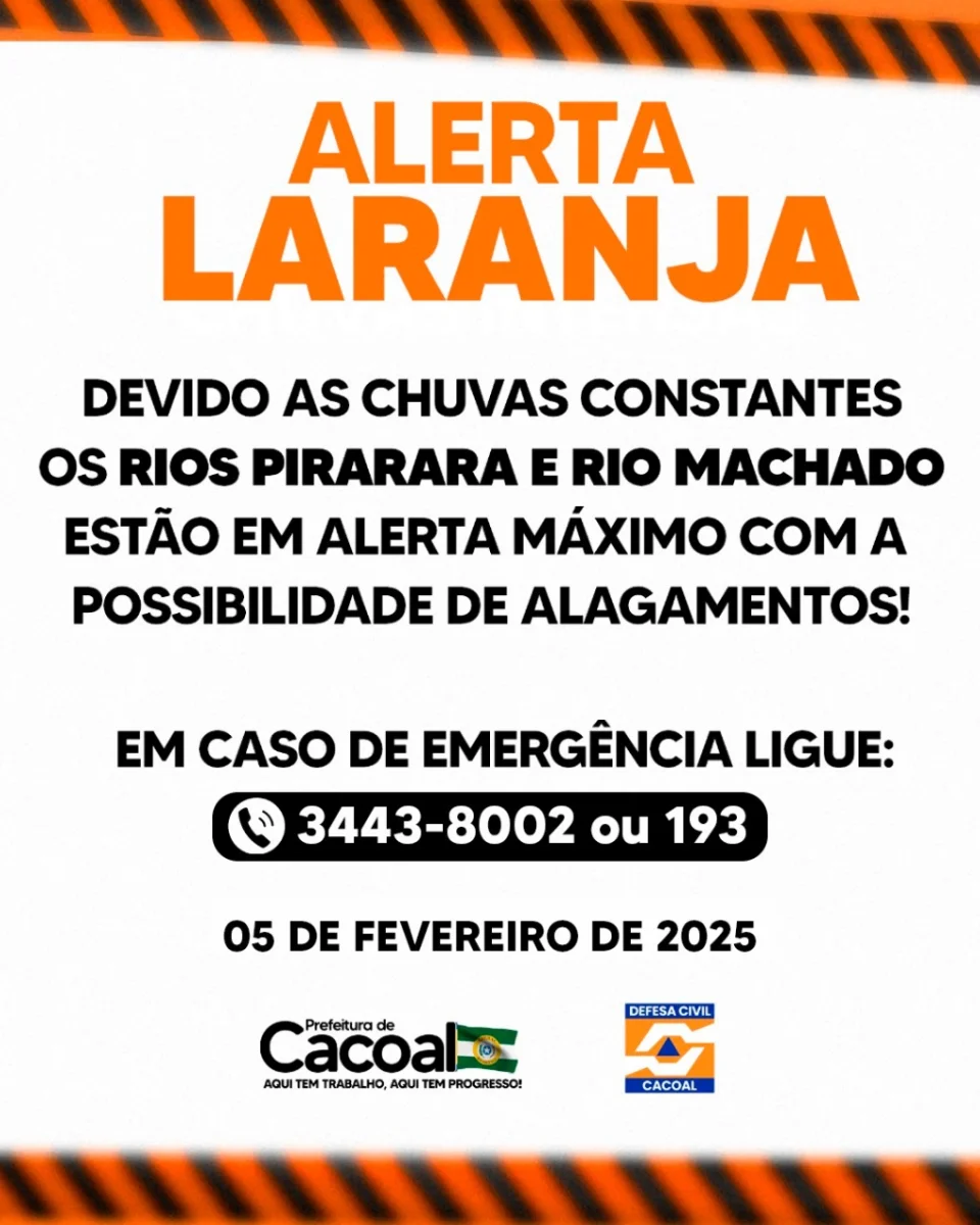 A Prefeitura de Cacoal e a Defesa Civil seguem monitorando a situação e reforçam a importância de que todos fiquem atentos às atualizações e instruções.