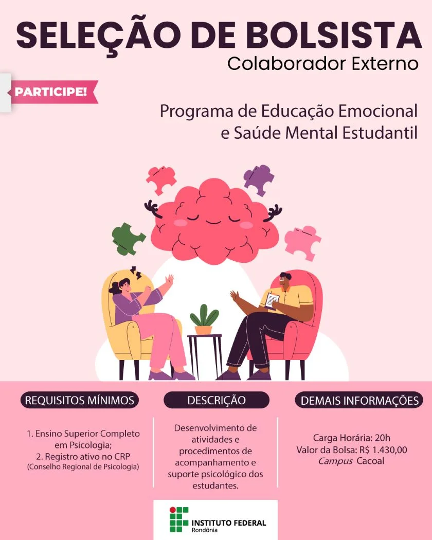 CACOAL — O Instituto Federal de Educação, Ciência e Tecnologia de Rondônia (IFRO) publicou edital de seleção de bolsista do Programa de Educação Emocional de Saúde Mental e Estudantil, no município de Cacoal. Podem participar da seleção profissionais graduados em Psicologia. O período de inscrições é de 31/1 a 14/2/2025.