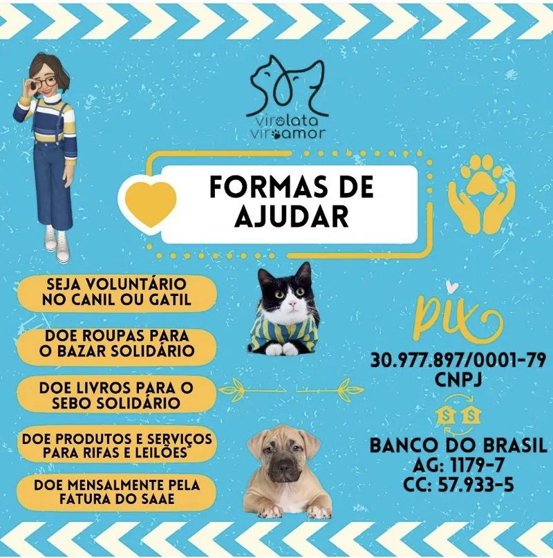 A Associação Protetora de Animais VIRA LATA VIRA AMOR sem fins lucrativos, desenvolve suas atividades no município desde 2018, atende no resgate e reabilitação de cães e gatos disponibilizando para adoção responsável. E para continuar com este trabalho maravilhoso e tão necessário em qualquer sociedade, ele precisa de nossas DOAÇÕES. Veja como é fácil. DOE O QUE PUDER, os pets agradecem.