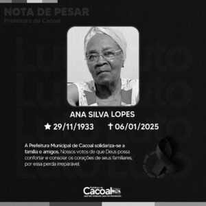 É com profundo pesar que a Prefeitura Municipal de Cacoal, em nome do prefeito Adailton Fúria, manifesta suas mais sinceras condolências pelo falecimento de Ana Silva Lopes, ocorrido em 6 de janeiro de 2025.