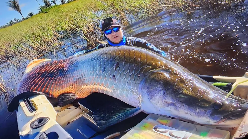 Vara de pescar quebrada, boca machucada e muito cansaço: esse foi o preço que o pescador Fábio Baca pagou para conseguir fisgar, colocar dentro do caiaque e fotografar um pirarucu com mais de dois metros e 100 quilos no rio Madeira, em Porto Velho.
