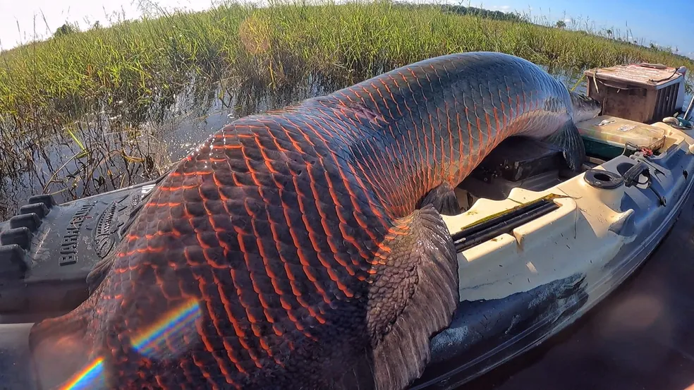 Pirarucu de mais de 2 metros dentro do caiaque de Fábio Baca — Foto: Fábio Baca“Ele deu