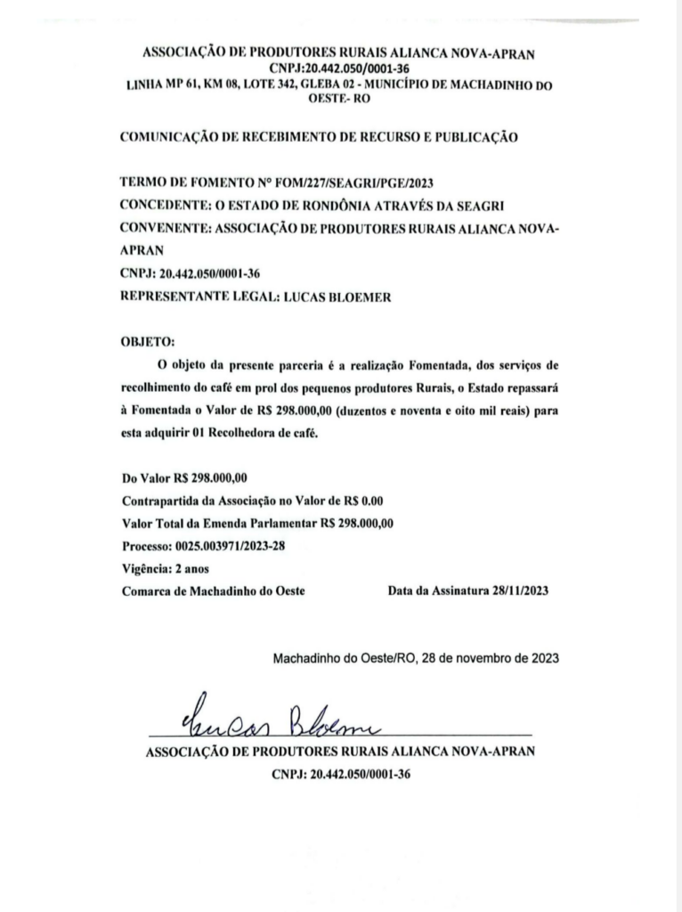 COMUNICAÇÃO DE RECEBIMENTO DE RECURSO E PUBLICAÇÃO ASSOCIAÇÃO NOVA ALIANÇA