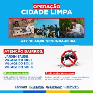 Equipes da prefeitura estarão no próximo dia 17, segunda-feira nos bairros Jardim Saúde e Village I, II e II, recolhendo entulhos e quaisquer descartes que sirvam como criadouro de mosquito da dengue.