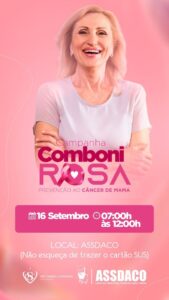 O evento citado pela Dra. Maureen é a campanha Comboni Rosa, mais uma iniciativa da Associação Assistencial à Saúde São Daniel Comboni (ASSDACO). Desta vez, a nova edição do Comboni Rosa é realizada no sábado, dia 16 de setembro, entre às 7h e 12h e acontece na própria sede da ASSDACO, localizada na Av. Rosilene Xavier Transpadini nº 2200, ao lado do Hospital Heuro.