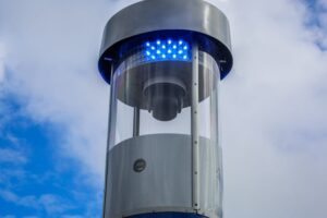 Os totens de segurança têm quatro metros de altura e possuem sistema de sirene, giroflex para alertas instantâneos, e câmeras com 360 graus que fazem o reconhecimento facial de pessoas com algum tipo de restrição na Justiça.