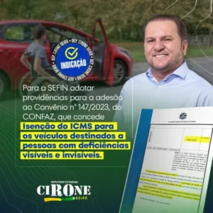 O governador, em resposta às demandas do deputado Cirone Deiró, encaminhou um projeto de lei que foi aprovado por unanimidade pelos deputados e aguarda a sanção nos próximos dias. A justificativa apresentada pelo parlamentar é de que que o antigo limite dificultava o acesso ao benefício de isenção do ICMS, pois não havia veículos adequados no mercado no valor anterior para atender às necessidades específicas das pessoas com deficiência.