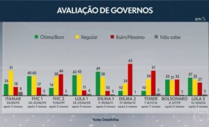 De acordo com a pesquisa Datafolha, divulgada neste sábado (17), sobre o terceiro mandato de Lula, 37% dos entrevistados consideram seu governo como ótimo ou bom, 27% o avaliam como ruim ou péssimo. Outros 33% consideram sua gestão regular, e 3% não expressaram opinião.