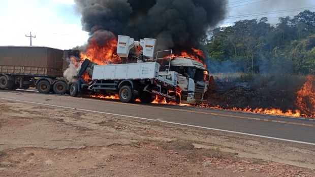 Porto Velho, RO – Na manhã hoje, um grave acidente ocorreu na BR-364, no trecho entre as cidades de Jaru e Ariquemes. Um caminhão e uma carreta, que seguiam em sentidos opostos, colidiram de frente, resultando em um incêndio que rapidamente se alastrou pelos veículos envolvidos.