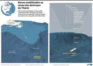 A busca, na qual participam navios, robôs e aviões, entrou em fase crítica nesta quinta-feira, já que as 96 horas de oxigênio de emergência à disposição do submersível Titan, da empresa privada OceanGate Expeditions, teriam se esgotado às 08h08 desta quinta-feira.