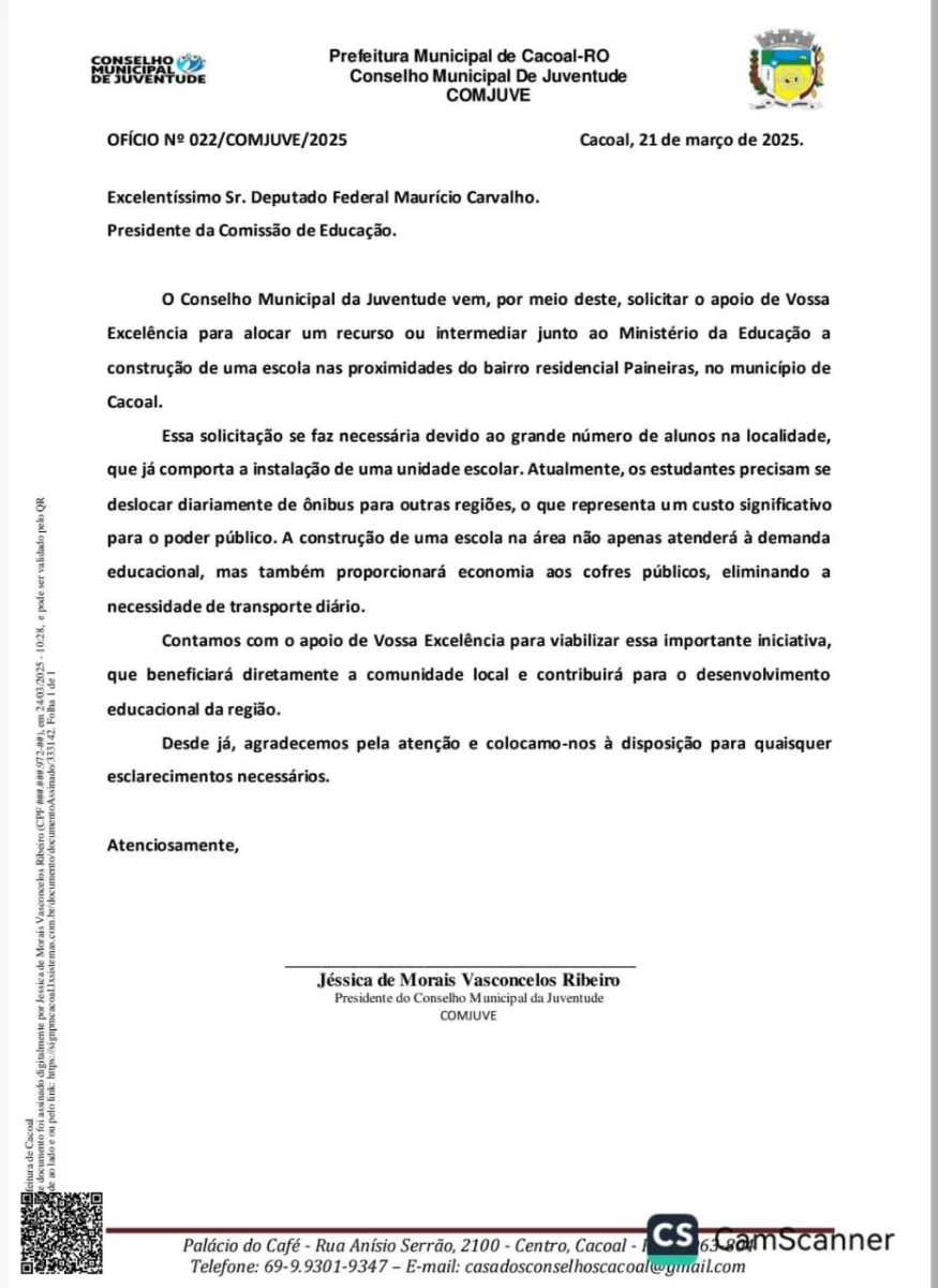 O Conselho Municipal da Juventude, representado pela Presidenta Annie Jéssica, encaminhou um pedido ao deputado federal Maurício Carvalho, presidente da Comissão de Educação, solicitando apoio para alocar recursos ou intermediar junto ao Ministério da Educação a construção de uma escola nas proximidades do bairro residencial Paineiras, no município de Cacoal.