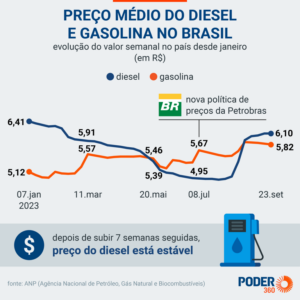 O preço da gasolina foi negociado a um valor médio de R$ 5,82 na semana de 17 a 22 de setembro. Na semana anterior, estava em R$ 5,84. Foi a 4ª semana de queda consecutiva. Os dados são da ANP (Agência Nacional de Petróleo, Gás Natural e Biocombustíveis). O combustível está em queda desde a última semana de agosto, quando atingiu o maior valor do ano ao ser vendido nos postos a R$ 5,88. Em comparação ao início do ano, o combustível acumula aumento de 13,7%. No 1º balanço semanal da ANP em 2023, a gasolina era vendida a R$ 5,12. O Estado com a gasolina mais barata na semana foi o Mato Grosso do Sul, onde foi negociada a uma média de R$ 5,59 o litro. Já o Amazonas teve a mais cara do país, com preço médio de R$ 6,60. Diesel e etanol estáveis O preço do óleo diesel ficou estável nesta semana no Brasil, sendo vendido em média a R$ 6,10. Embora tenha ficado no mesmo patamar da semana anterior, o valor continua sendo o mais alto desde fevereiro. O combustível vinha num cenário de escalada nos preços, tendo chegado a 7 semanas consecutivas de alta. Já o etanol também ficou estável, sendo vendido em média a R$ 3,64. O consumo do biocombustível tem crescido no país diante do elevado preço da gasolina. O Brasil importa cerca de 25% do diesel que é consumido internamente. Como a nova política de preços da Petrobras não segue totalmente o cenário externo, cria-se uma defasagem crescente entre os preços internos e os praticados internacionalmente, o que dificulta as importações. O cenário só não era pior até agora porque o Brasil, sobretudo a Petrobras, intensificou nos últimos meses a compra de diesel da Rússia. Em guerra, o país vinha exportando a preços menores, já que tem restrições no comércio internacional com vários países e precisava escoar o derivado.No entanto, a Rússia anunciou na 5ª feira (21.set) restrições temporárias na exportação de diesel e gasolina. O objetivo é equilibrar a oferta no mercado interno do país. A medida deve afetar o mercado brasileiro nas próximas semanas. Como noticiado pelo Poder360, o preço dos combustíveis já tem uma tendência de crescimento no restante de 2023, diante dos cortes na produção de petróleo na Arábia Saudita e na Rússia, o que tem pressionado as cotações do barril. © Fornecido por Poder360 Edição JLR]]>