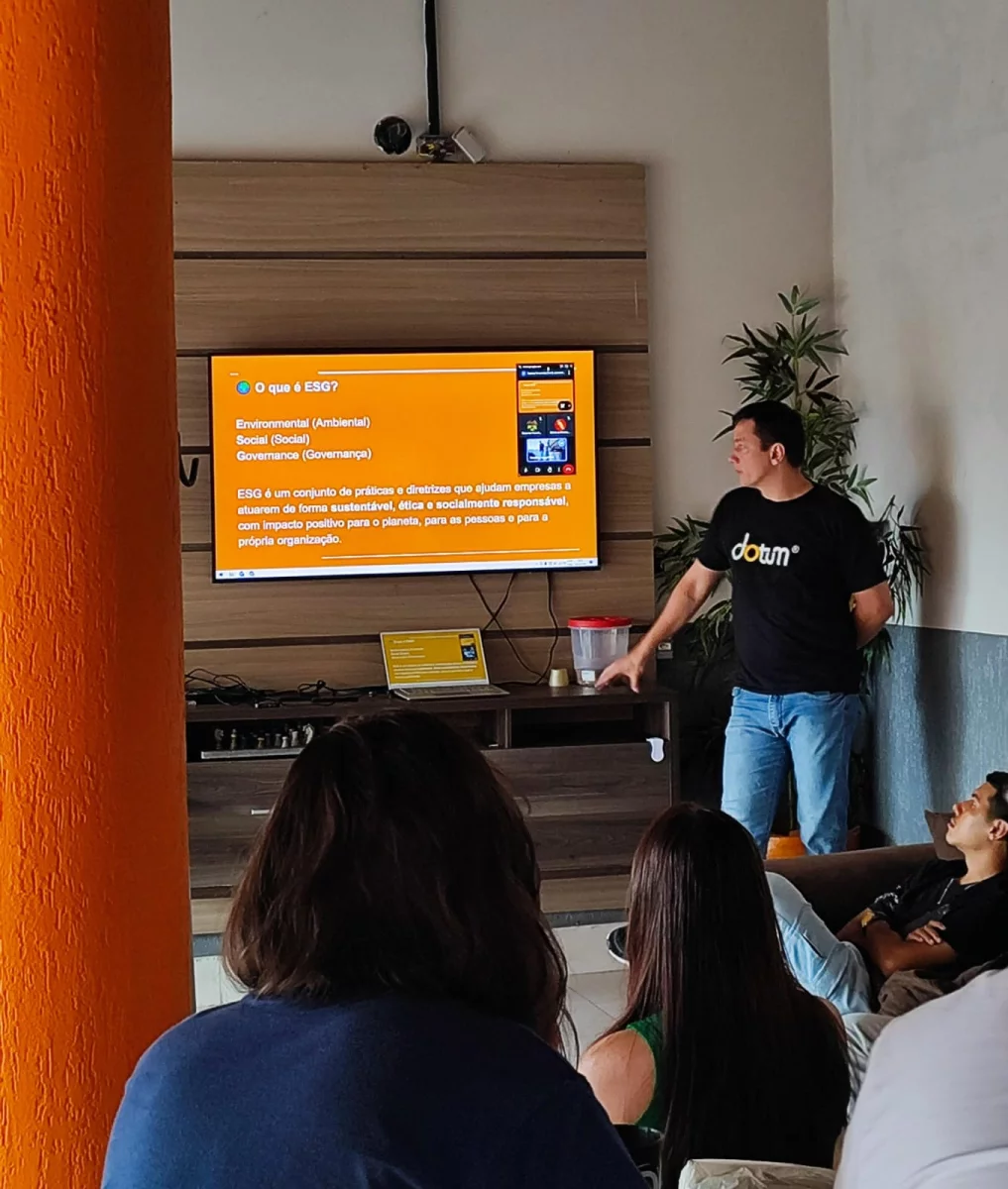 A partir das práticas de ESG, a Dotum firma o seu compromisso ambiental com o planeta, por meio de ações como o uso consciente de energia, água e papel, reaproveitamento e descarte consciente de equipamentos eletrônicos, coleta seletiva, entre outras ações.
